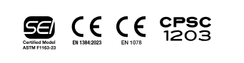 Kask spełnia normy: CE EN1384:2023, SEI ASTM F1163-23, EN 1078