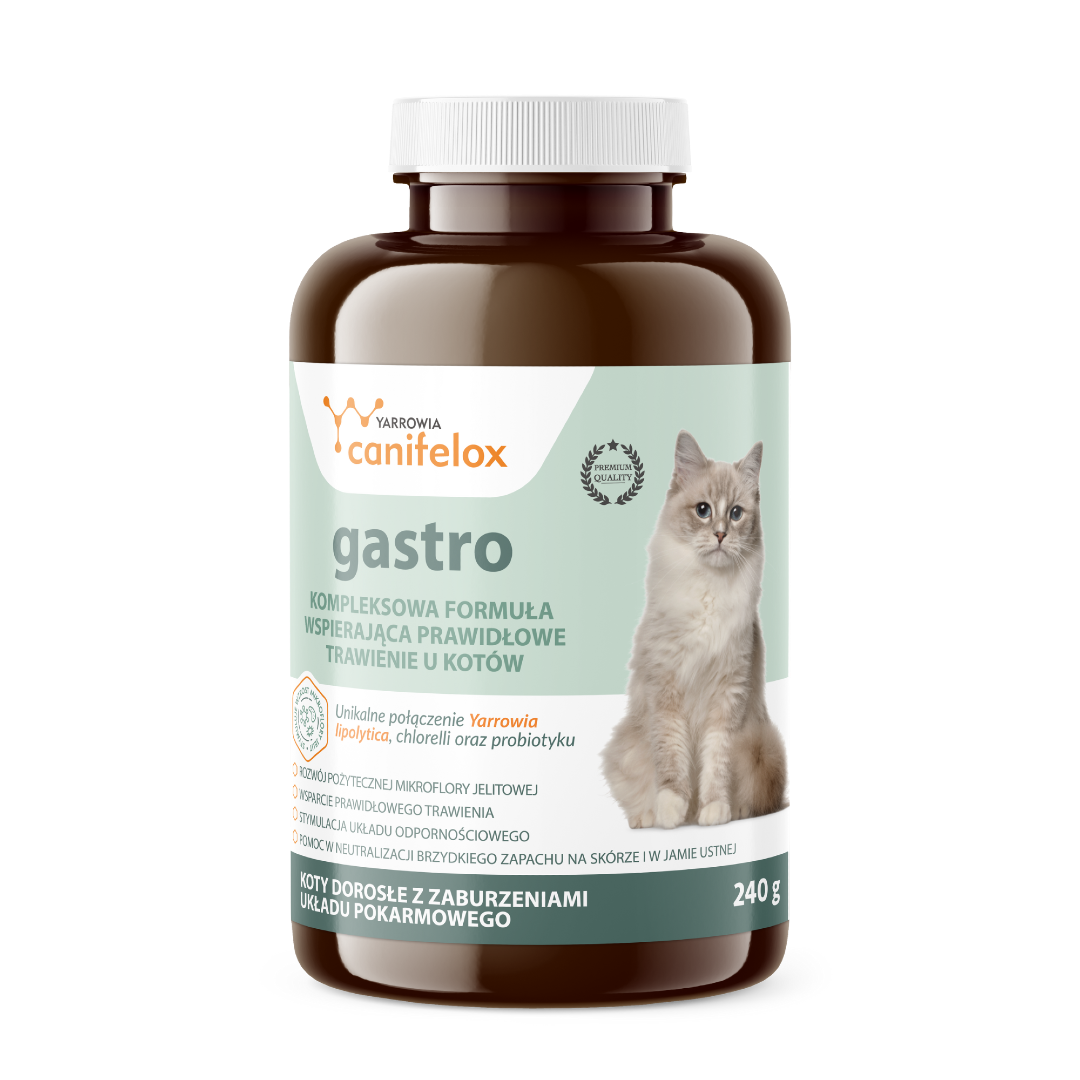 Canifelox Gastro Cat to specjalistyczny preparat wspierający prawidłowe trawienie i zdrową mikroflorę jelitową u kotów. Synbiotyczna formuła łączy drożdże Yarrowia lipolytica z dwoma szczepami bakterii probiotycznych oraz chlorellą, aby wspomagać procesy trawienia, wchłaniania składników odżywczych i naturalną odporność.