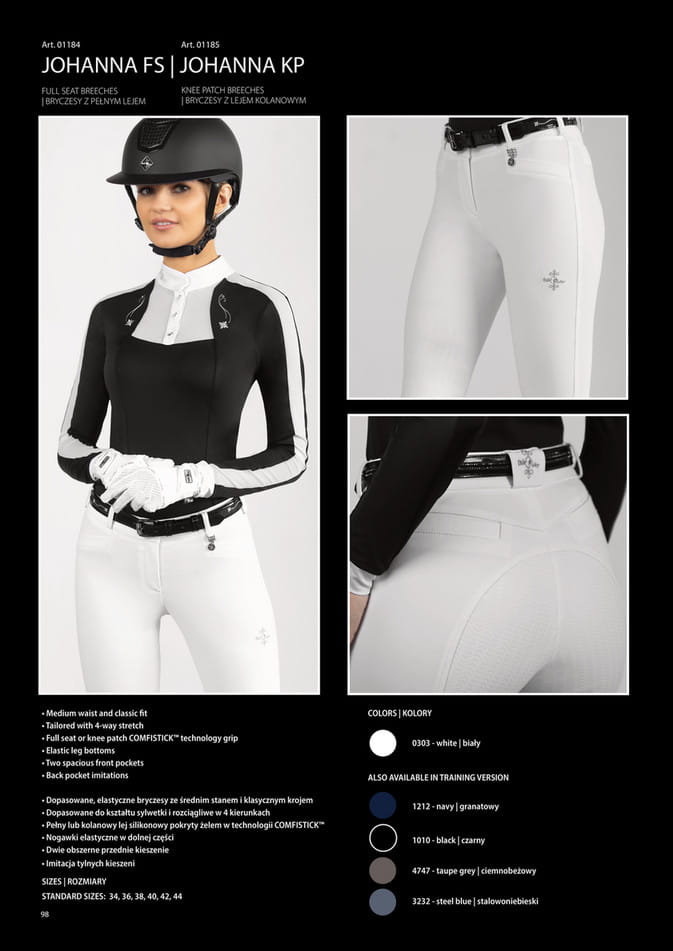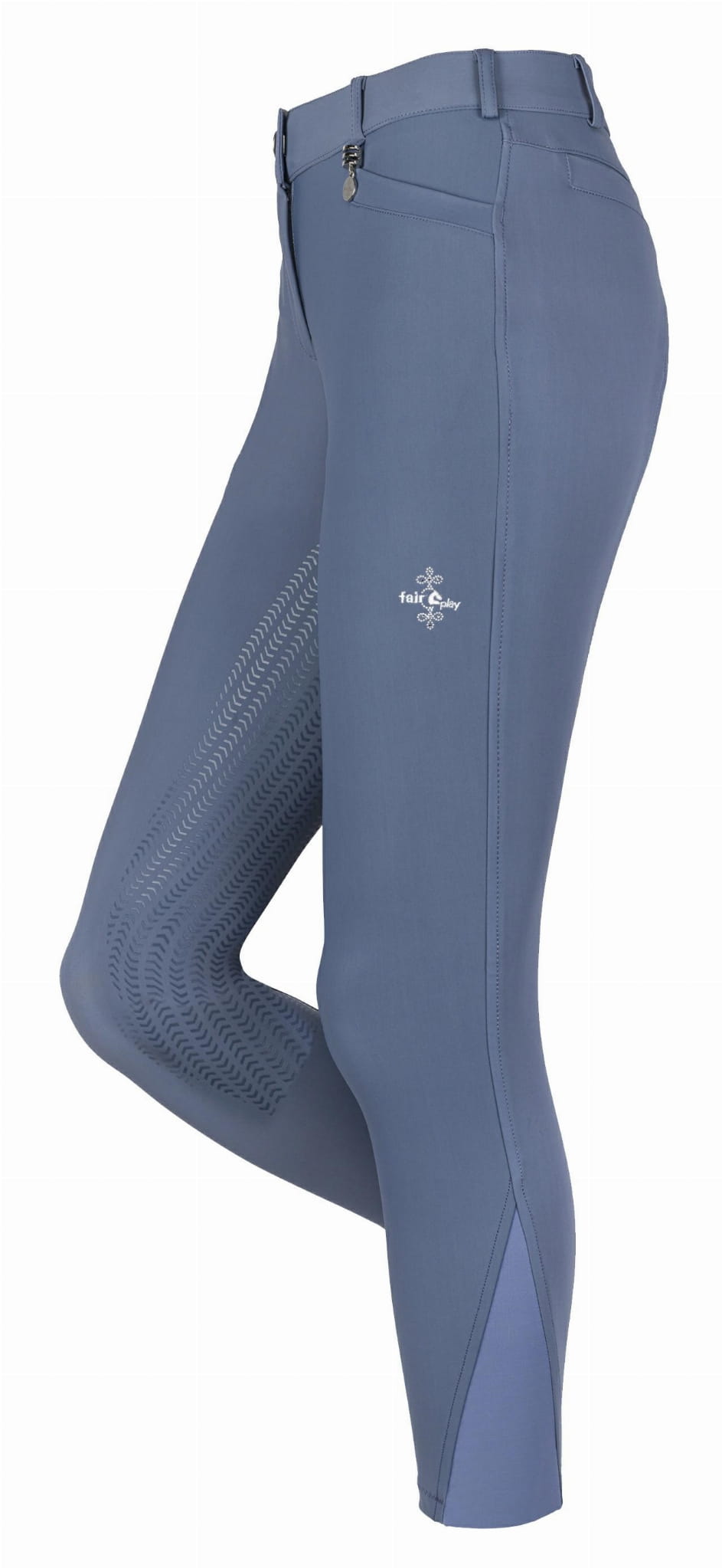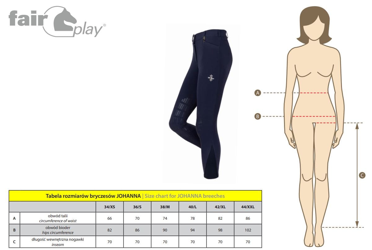 Eleganckie bryczesy Fair Play Johanna ze średnim stanem i klasycznym krojem. Świetnie dopasowane do kształtu sylwetki, rozciągliwy w 4 kierunkach materiał nie krępuje ruchów. Silikonowy lej kolanowy pokryty żelem COMFISTICK zapewnia optymalną przyczepność. Nogawki elastyczne w dolnej części ułatwiają zakładanie. Dwie obszerne przednie kieszenie oraz imitacja tylnych.