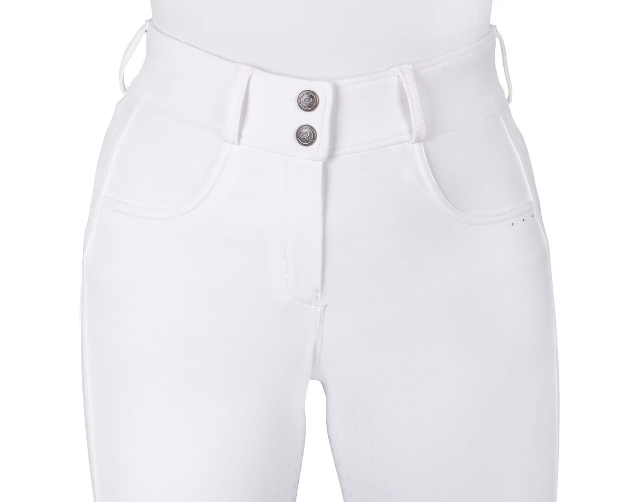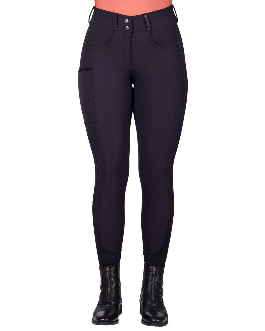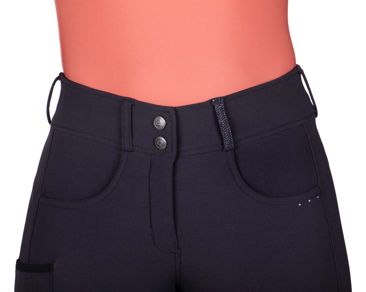 Bryczesy zimowe z wysokim stanem QHP Kae. Wykonane z elastycznego materiału typu 4-way stretch. Wysoki stan i szlufki na pasek. Oddychający materiał odprowadzający wilgoć. Pełny lej silikonowy. Ozdobione delikatnymi aplikacjami z cyrkonii. Białe posiadają zaszyte kieszenie, natomiast czarne mają standardowe kieszenie z prozdu oraz dodatkową kieszeń na udzie.