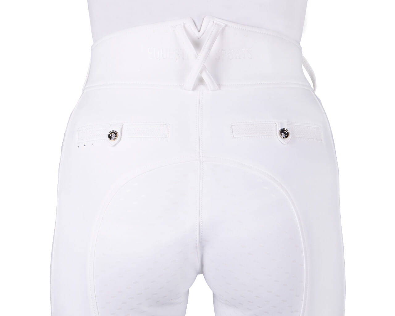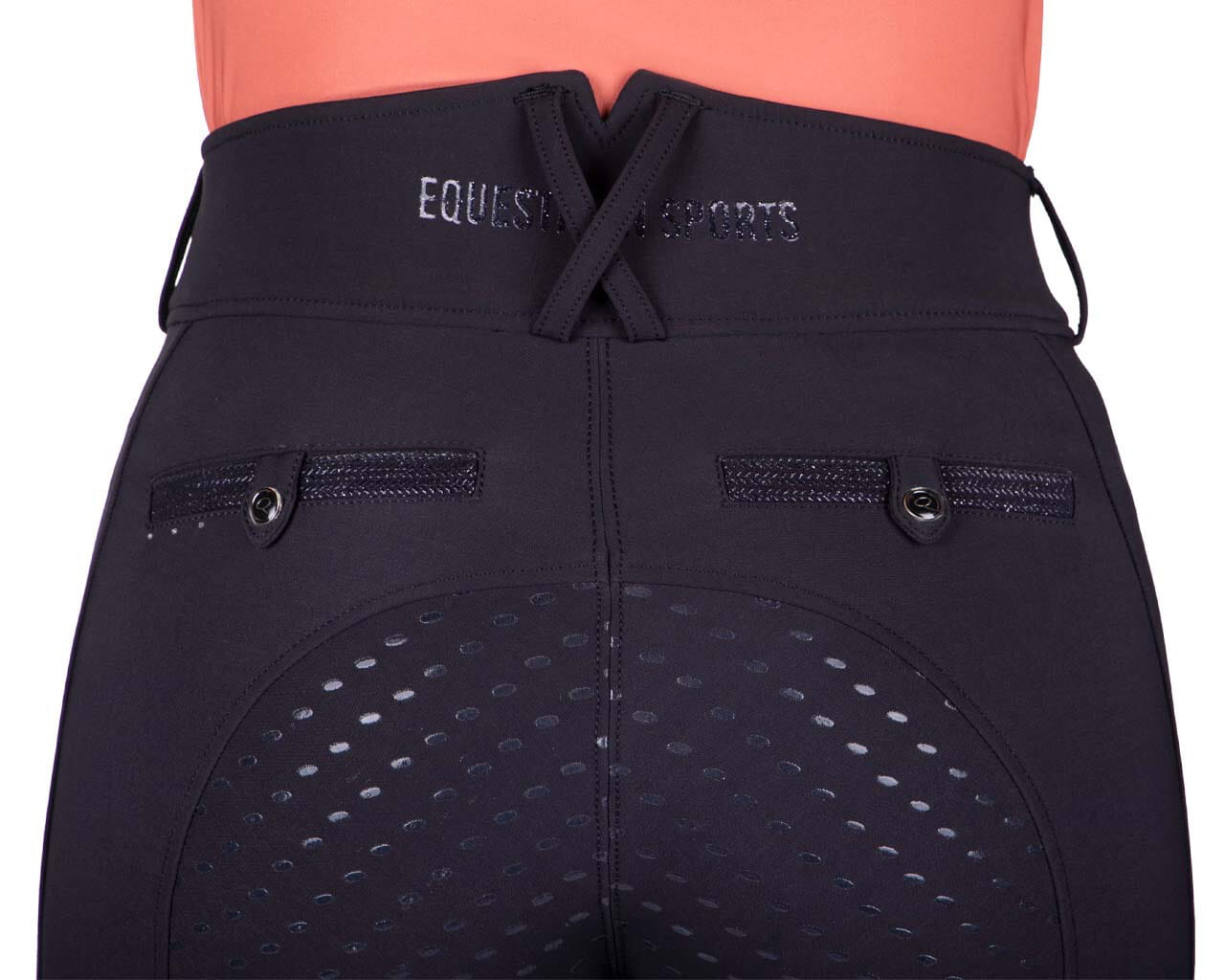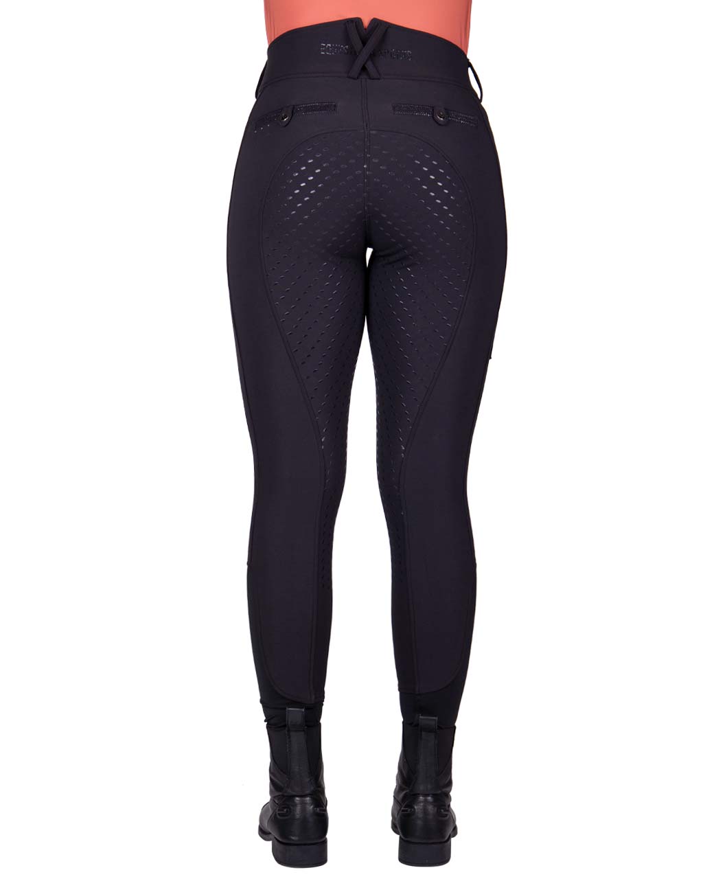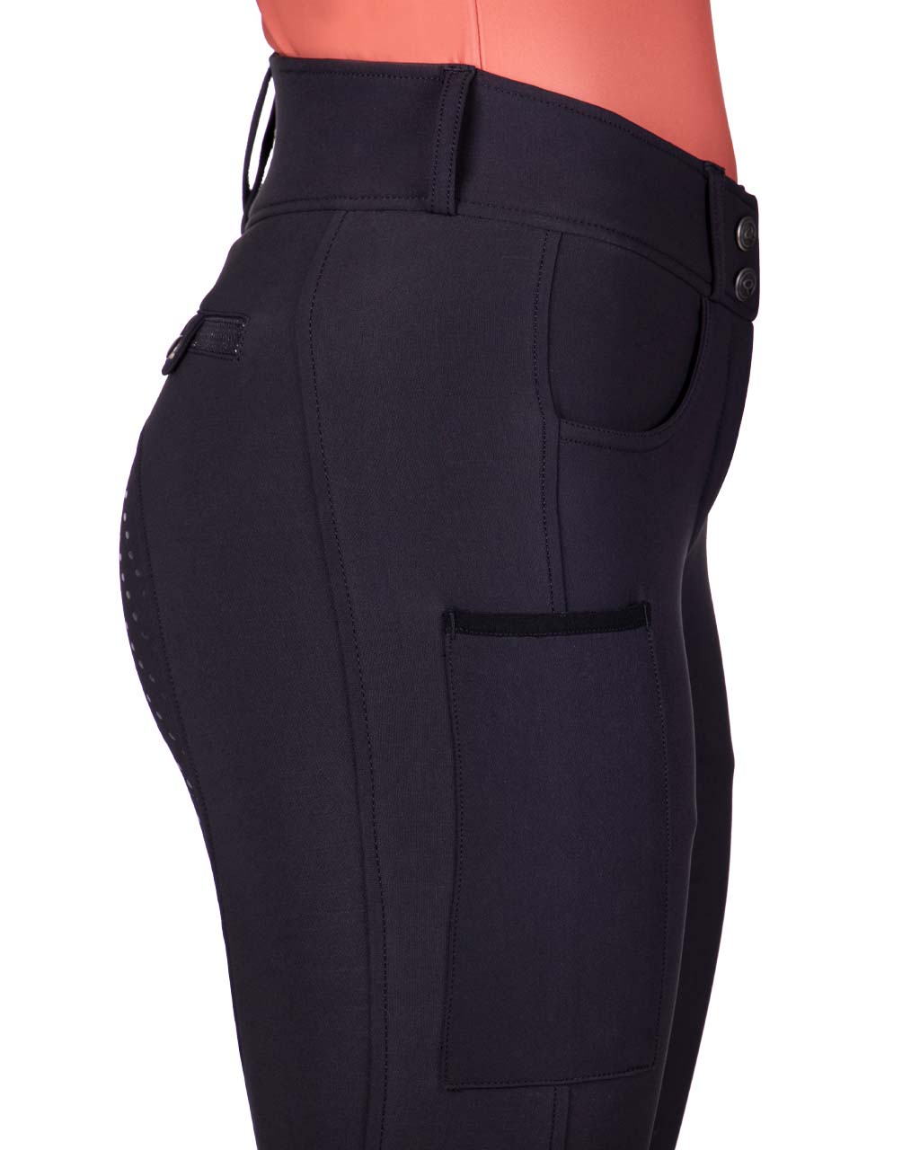 Bryczesy zimowe z wysokim stanem QHP Kae. Wykonane z elastycznego materiału typu 4-way stretch. Wysoki stan i szlufki na pasek. Oddychający materiał odprowadzający wilgoć. Pełny lej silikonowy. Ozdobione delikatnymi aplikacjami z cyrkonii. Białe posiadają zaszyte kieszenie, natomiast czarne mają standardowe kieszenie z prozdu oraz dodatkową kieszeń na udzie.
