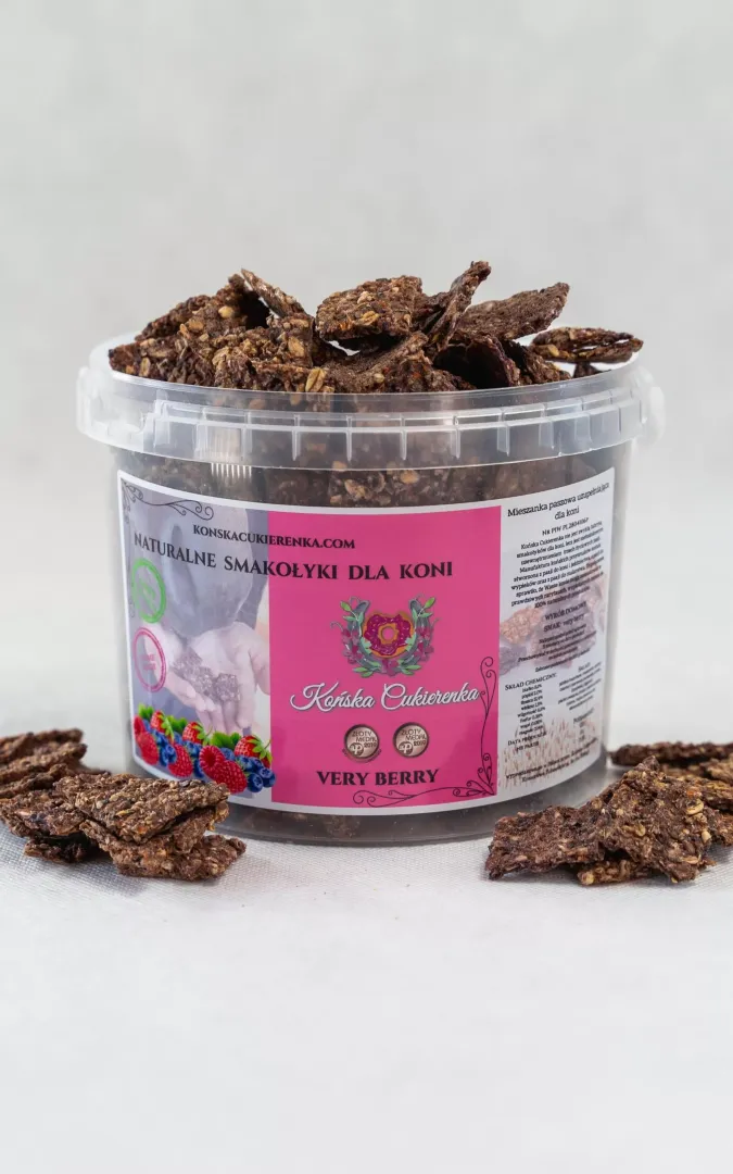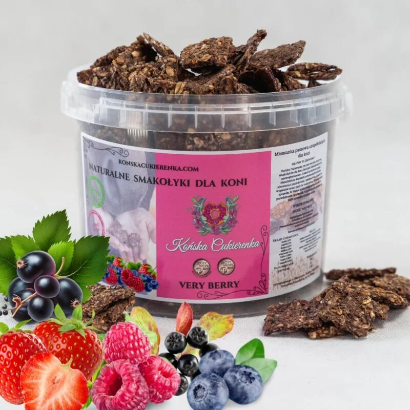 Mieszanka paszowa uzupełniająca ciastka Końska Cukierenka JMSHorse Treats Very Berry o smaku owoców leśnych( borówek, jagód, malin, truskawek, porzeczek i aronii).