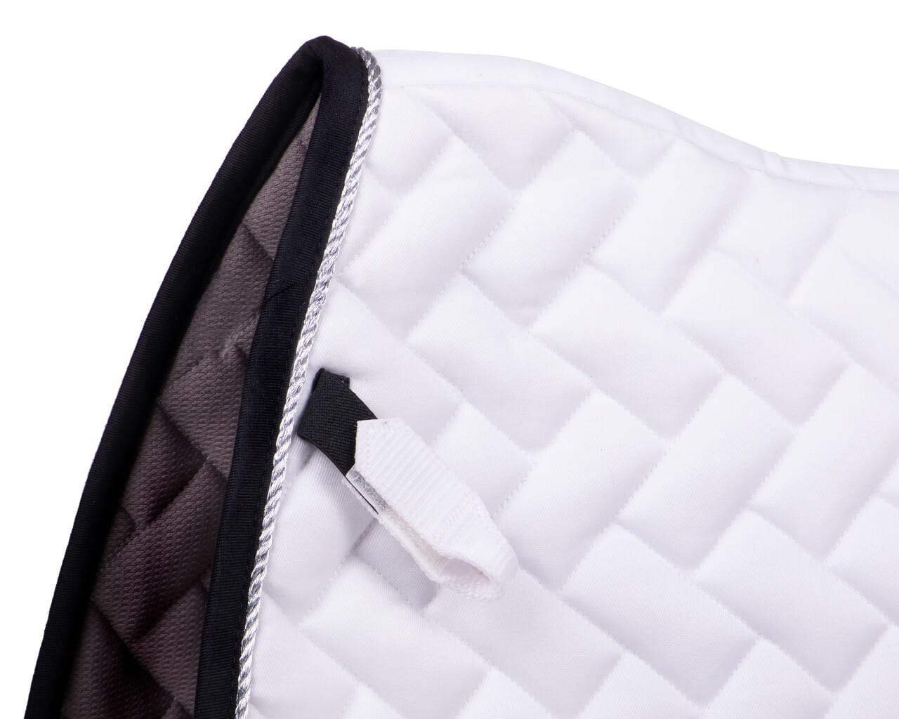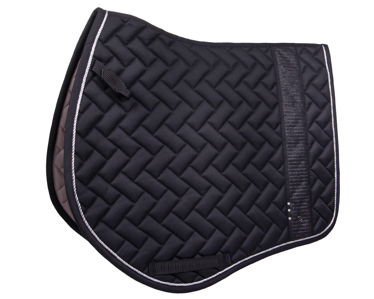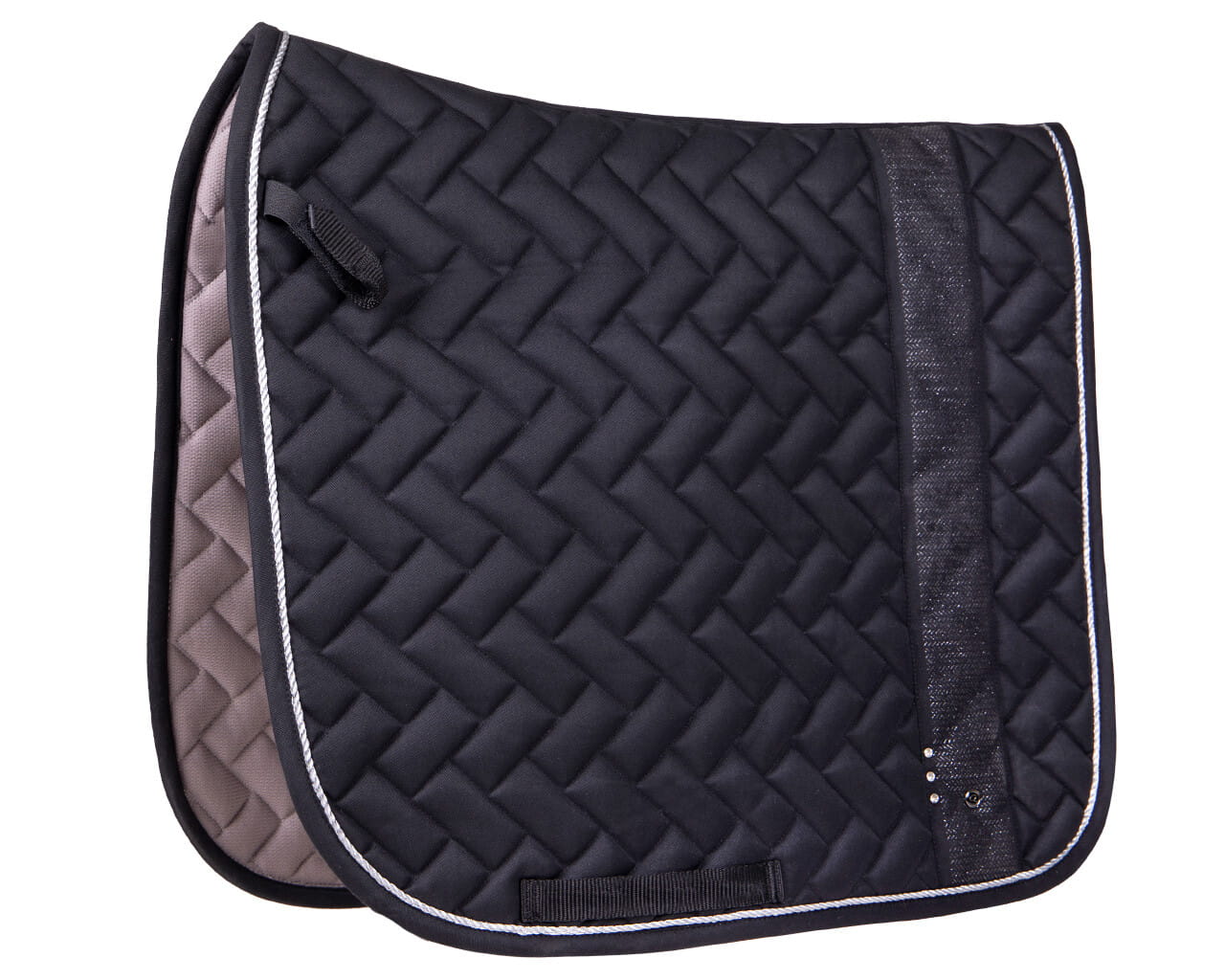 Elegancki czaprak z ozdobną aplikacją QHP Kae Anatomicznie profilowana linia grzbietu. Naszyta ozdobna aplikacja w okolicach tylnego łęku oraz trzy subtelne diamenciki. Kontrastujące detale. Wyposażony w krótkie paski do D-ringów oraz szlufki na popręg. Stwórz wyjątkowy zestaw z innymi produktami z kolekcji Kae.