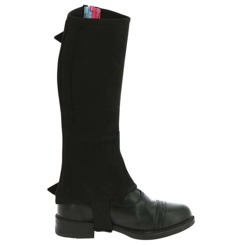 Zabezpieczenie zamka zatrzaskiem na skórzanej patce przy kostce i elastycznym paskiem u góry.