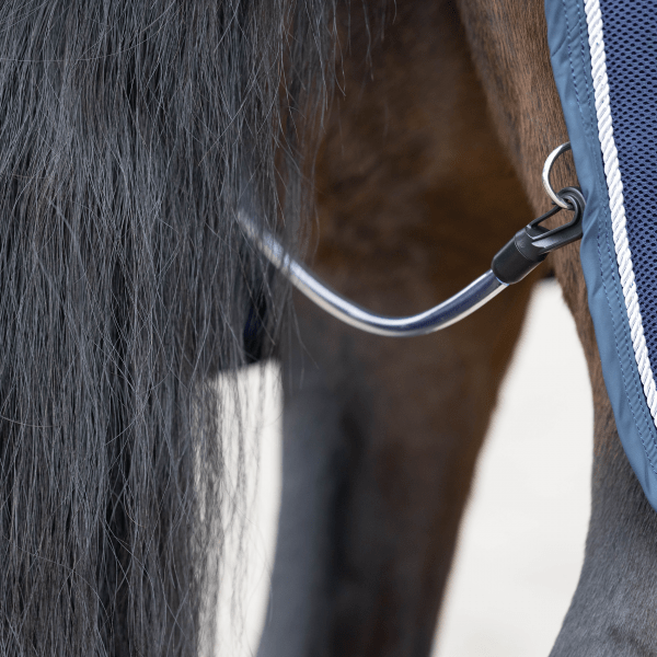 - Regulowane pasy krzyżowe: Pasy są regulowane, odpinane za pomocą innowacyjnego systemu zapięć na rzepy, co czyni derkę idealną do transportu oraz użytku w boksie.