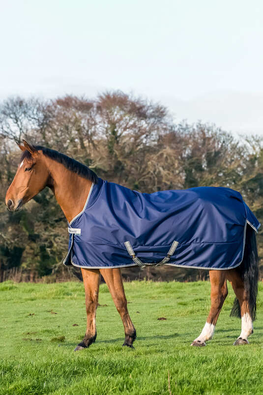 - Wodoodporna i oddychająca: Derka jest wodoodporna (>5000 mm słup hydrostatyczny) i oddychająca (>3000 g/24h/m²), co chroni Twojego konia przed deszczem, jednocześnie zapewniając mu komfort termiczny.