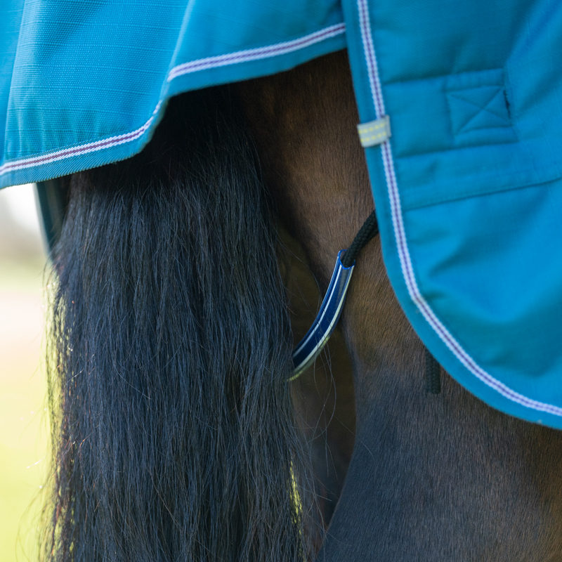 Dla pewnego dopasowania i stabilności derka posiada regulowane, podwójne zapięcie z przodu, elastyczne pasy krzyżowe pod brzuchem oraz pasy między nogami, które skutecznie chronią przed zsunięciem się derki. Klapa na ogon oraz odblaskowy pasek poprawiają widoczność i ochronę przed brudem i deszczem.
