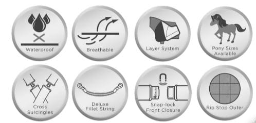 - Świetny krój: Anatomicznie dopasowany krój derki oraz paski krzyżowe i możliwość dopięcia pasków na nogi gwarantują doskonałe dopasowanie i stabilność derki na koniu.