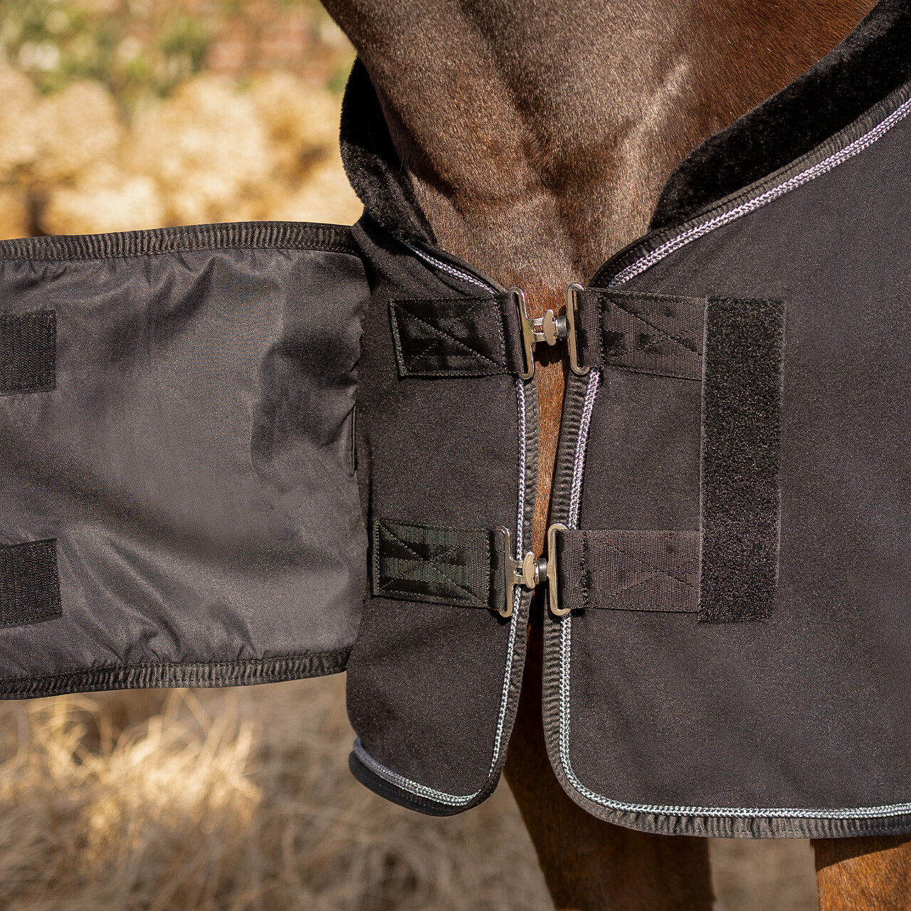 Derka polarowa QHP Salerno to połączenie elegancji, komfortu i skutecznego osuszania konia. Wykonana z miękkiego polaru, doskonale sprawdza się po treningu, w transporcie oraz podczas chłodniejszych dni w stajni. Luksusowy kołnierz i ozdobny sznur nadają jej wyjątkowego charakteru, a pasy krzyżowe i sznur pod ogonem gwarantują idealne dopasowanie do konia.