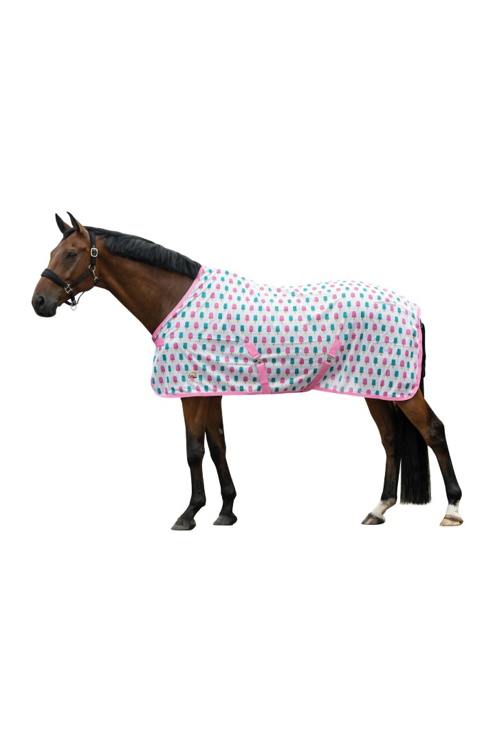 Derka HKM Naples to doskonały wybór na ciepłe, letnie dni, zapewniająca skuteczną ochronę koni przed muchami i owadami. Dzięki regulowanym i odpinanym pasom krzyżowym derka gwarantuje idealne dopasowanie i wygodę dla konia podczas odpoczynku świeżym powietrzu i w stajni. Modny nadruk z lodami na patyku stylu, wyróżniając konia na tle innych.