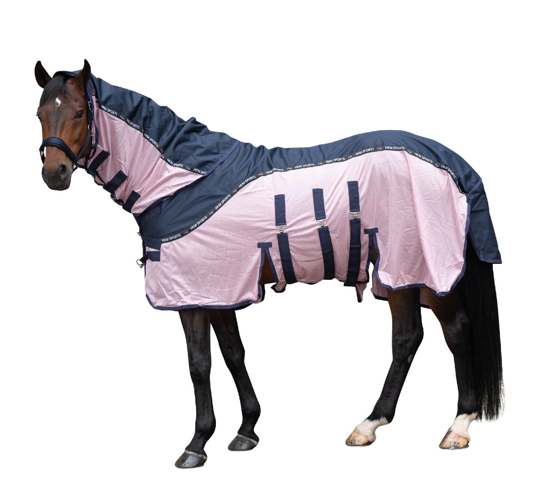 Przeciwdeszczowa derka siatkowa z kapturem dla konia – ochrona przed owadami i deszczem.