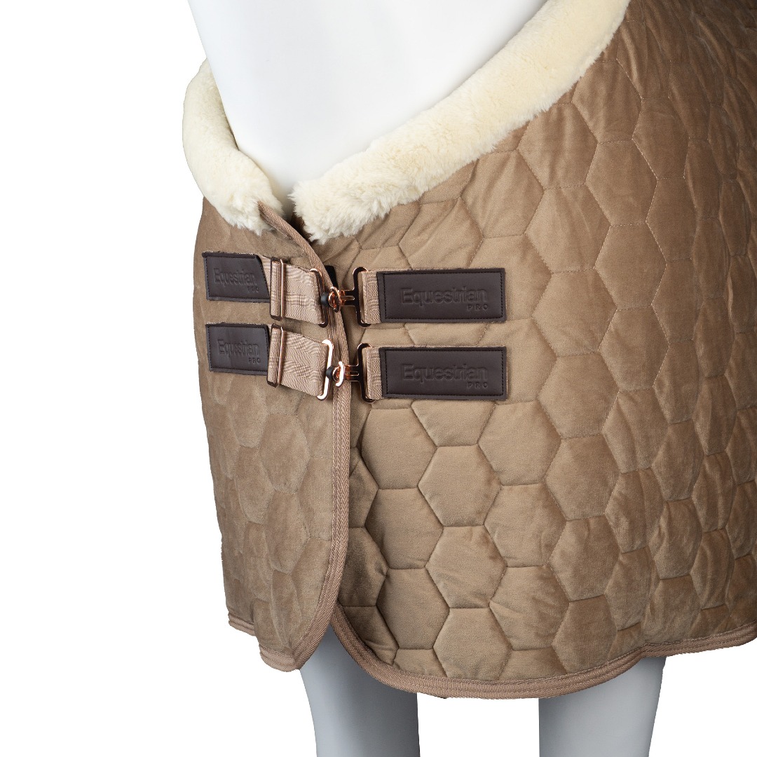 Zimowa derka stajenna Horka Velvet to połączenie luksusowego designu z funkcjonalnością. Wykonana z miękkiego, aksamitnego materiału o pikowanym wzorze, zapewnia komfort i elegancki wygląd Twojego konia podczas pobytu w stajni i na zawodach. Ciepła podszewka i kołnierz z polaru chronią przed chłodem, a detale w kolorze różowego złota dodają wyjątkowego stylu.