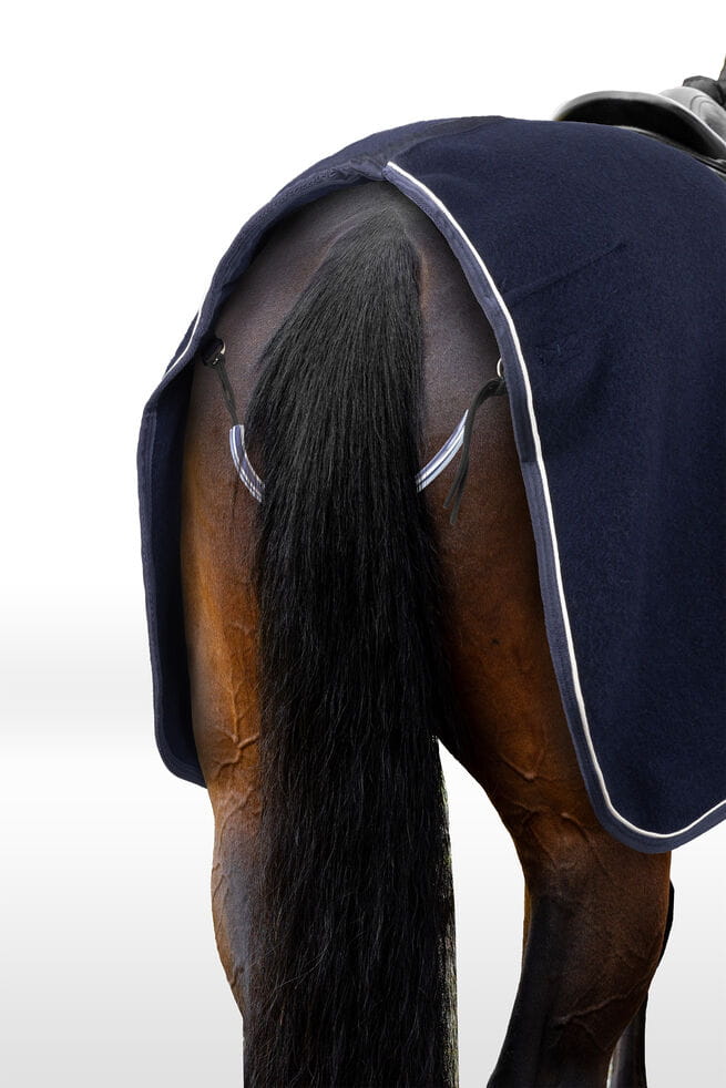 Wełniana derka treningowa QHP "Quarter" Derka ta zapobiega zbyt szybkiemu ochładzaniu się konia. Wełna posiada bardzo dobre właściwości izolacyjne i szybko odprowadza wilgoć. Mocowana za pomocą dwóch rzepów. Skład: 65% wełna, 35% poliester, gramatura 650g. Można prać w pralce w programie dla wełny z użyciem detergentów do wełny. Nie suszyć w suszarce.