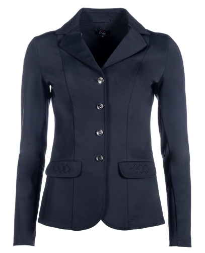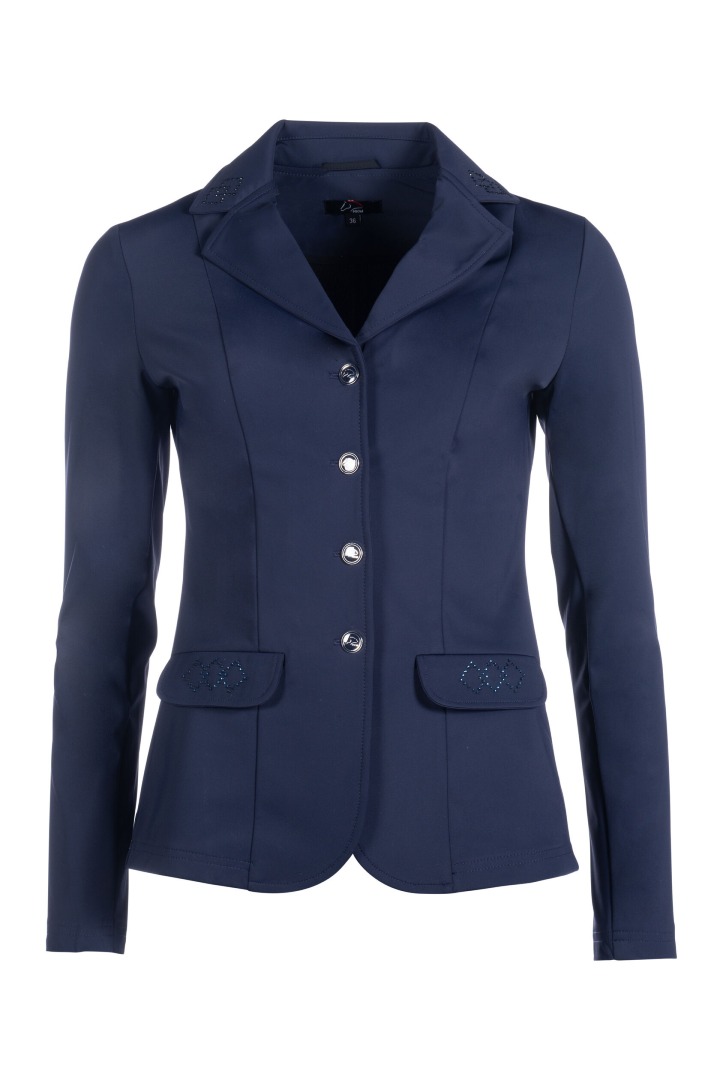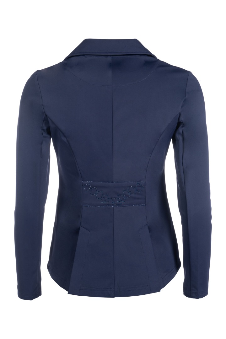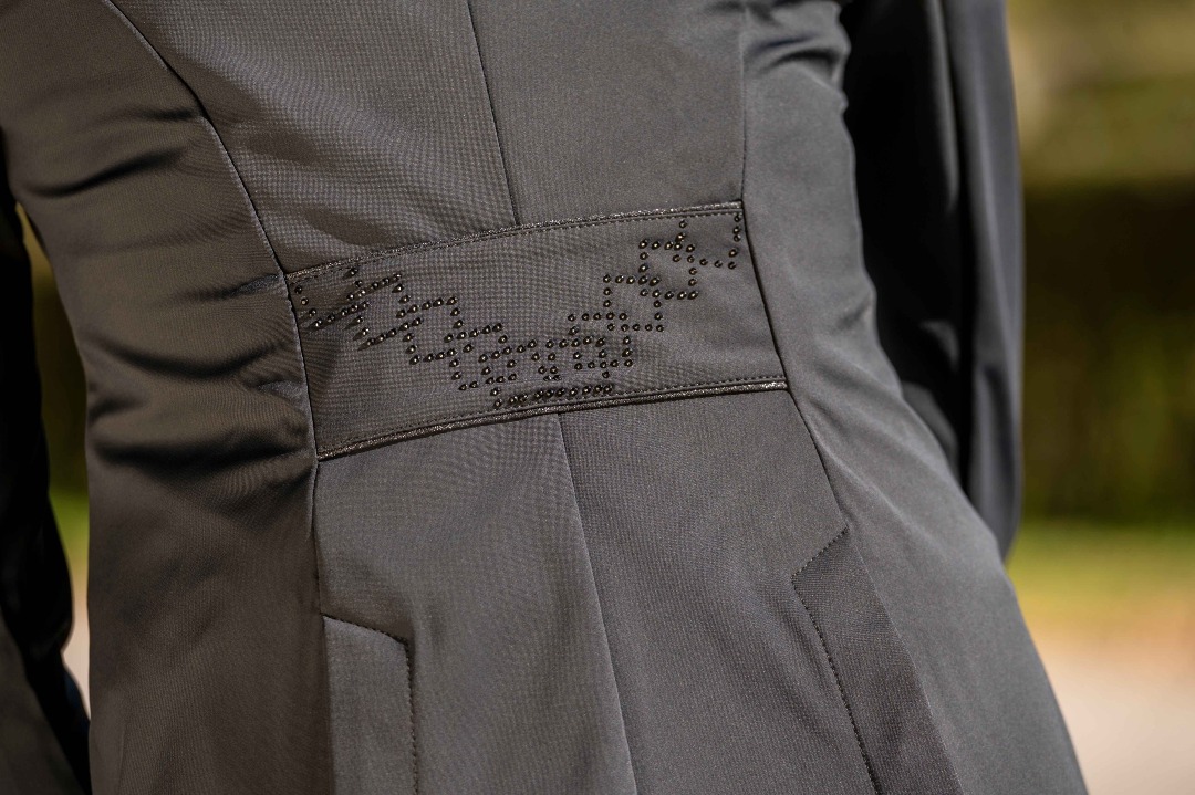 Frak HKM Aurora został stworzony z myślą o zawodniczkach, które chcą połączyć funkcjonalność, wygodę i elegancję. Wykonany z oddychającego materiału, zapewnia pełen komfort podczas startów, a dzięki innowacyjnym właściwościom – odrzucaniu brudu i odporności na zagniecenia – zawsze prezentuje się nienagannie, nawet po wielu godzinach spędzonych w siodle.Frak wyróżnia taliowany krój, który doskonale podkreśla sylwetkę, oraz subtelne zdobienia w postaci eleganckich kamyczków, dodających mu wyjątkowego charakteru. Ukryty suwak pod listwą guzikową zapewnia idealne dopasowanie, a rozcięcie w tylnej części gwarantuje swobodę ruchu podczas jazdy.