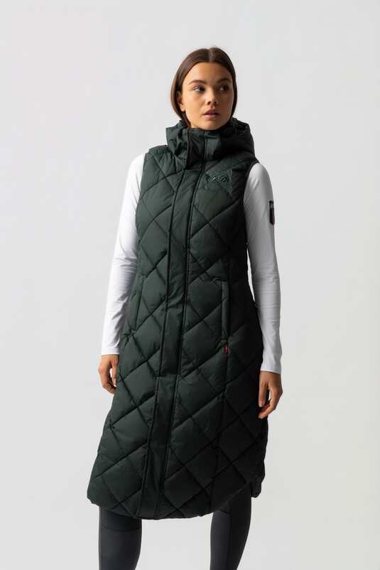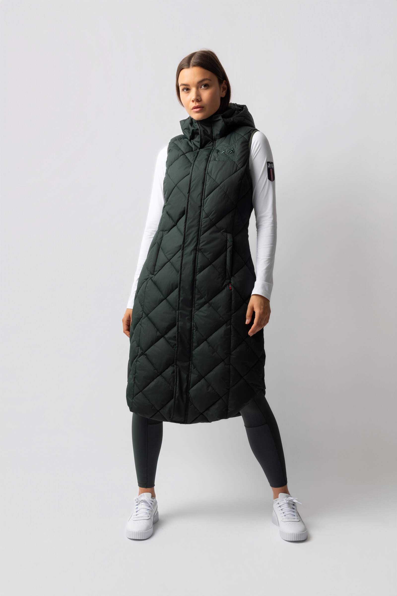 Połączenie luksusowego stylu i praktycznego komfortu. Wydłużony fason zapewnia ciepło nawet w chłodniejsze dni, a oddychająca, wodoodporna tkanina sprawia, że kamizelka doskonale sprawdza się w różnych warunkach pogodowych. Idealna dla jeźdźców, którzy cenią funkcjonalność, wygodę i modny wygląd.