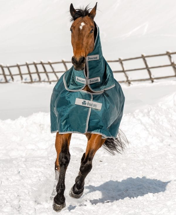 Zimowy kaptur Bucas Atlantic Neck 300g do derki padokowej zapewnia skuteczną ochronę szyi konia przed przemoknięciem, mrozem i przewianiem.