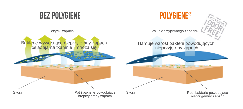 Polygiene ®- Technologia antybakteryjna wykorzystuje naturalne sole srebra, które ograniczają rozwój mikroorganizmów powodujących przykry zapach odzieży, butów czy nakryć głowy. Materiał zostaje nasączony/ spryskany specjalnym płynem, utrzymującym się na odzieży przez nawet ponad 100 prań.