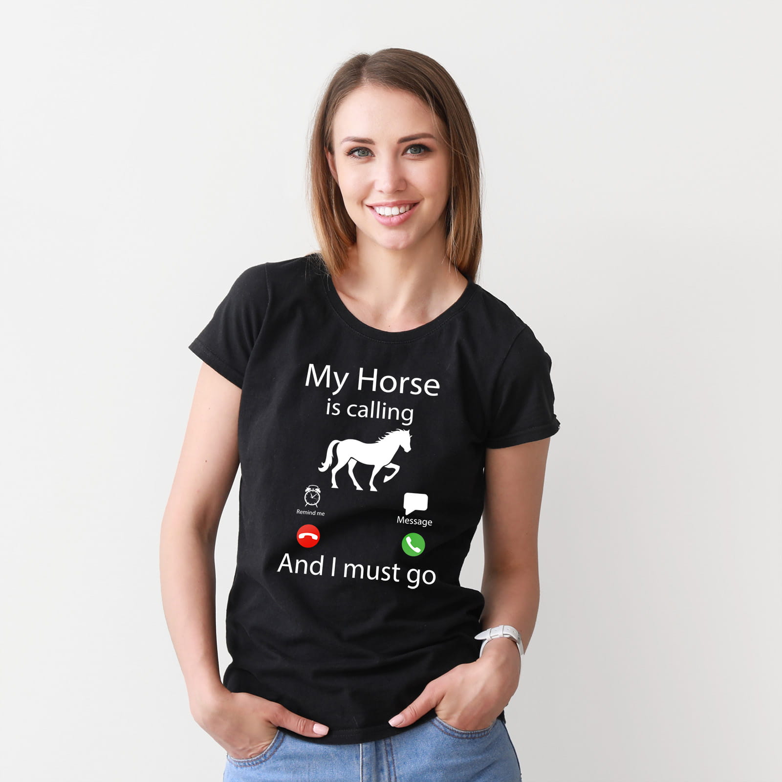 Popularny żart z rozmową telefoniczną teraz jako nadruk na koszulce dla miłośników koni! Koszulka jeździecka York idealnie sprawdzi się zarówno w stajni jak i na co dzień. Miękki i przewiewny materiał zapewni komfort w cieplejsze dni. Materiał: 100% bawełna.