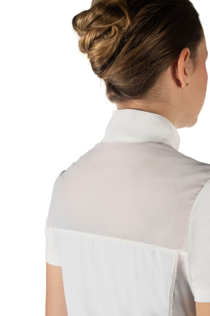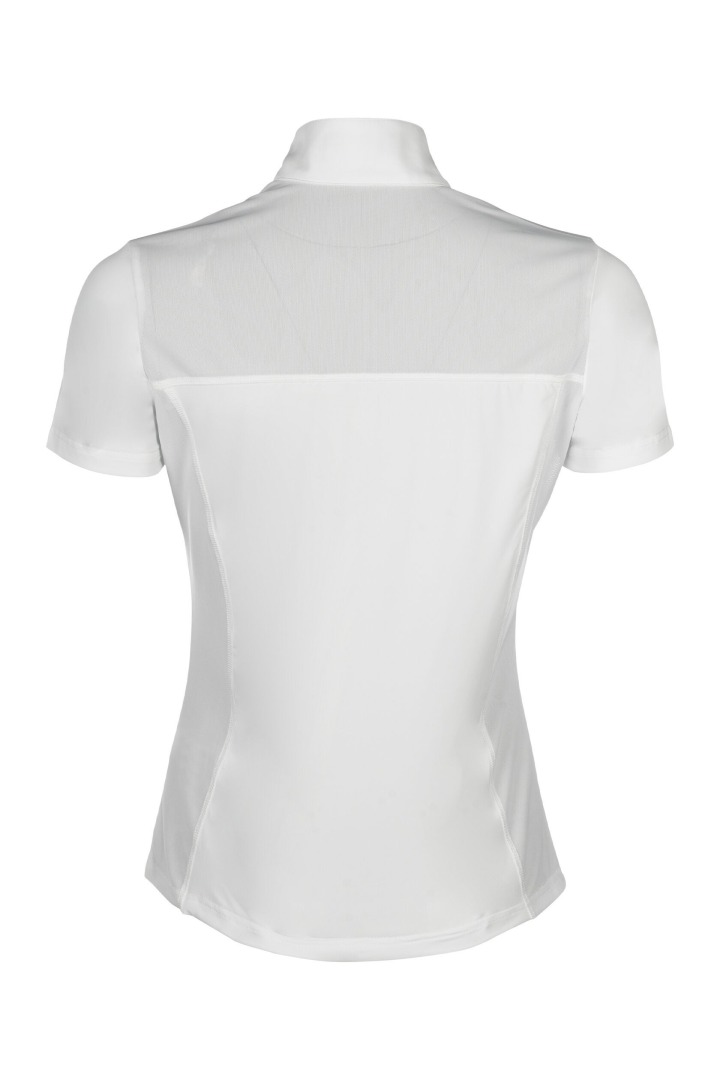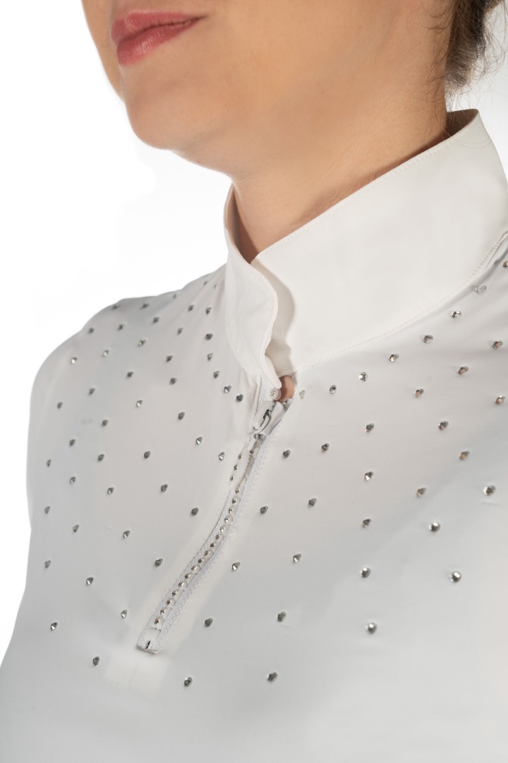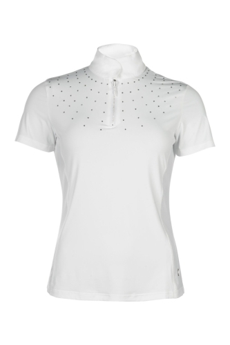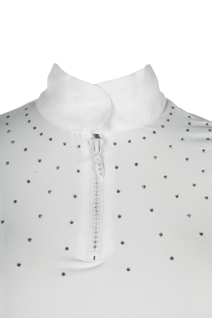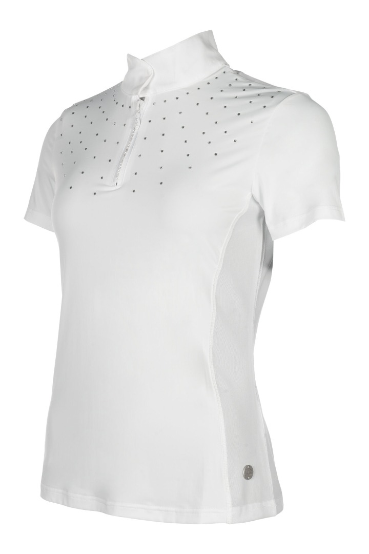 Koszulka konkursowa HKM Skadi to doskonały wybór dla amazonek, które cenią połączenie elegancji i wygody. Wykonana z oddychającego i elastycznego materiału, zapewnia optymalny komfort podczas zawodów, a dzięki wstawce z siatki gwarantuje świetną cyrkulację powietrza nawet w cieplejsze dni.Wyjątkowego uroku dodają jej drobne kryształki oraz zamek błyskawiczny ozdobiony wbudowanymi kamyczkami, które podkreślają stylowy, sportowo-elegancki charakter koszulki. Klasyczna stójka i subtelne zdobienia sprawiają, że model Skadi przyciąga wzrok na każdym turnieju, jednocześnie zapewniając swobodę ruchów i najwyższy komfort.