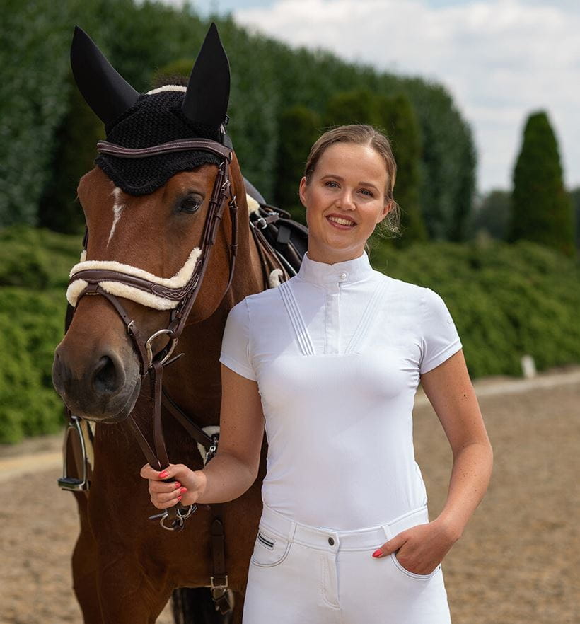 Na lewym rękawie wykonano srebrny haft "Equestrian Sports" i logo QHP "Q" z błyszczącym kamyczkiem z przodu.