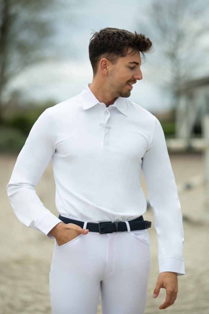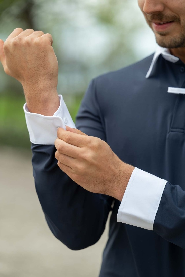 Koszulka konkursowa męska HKM Davie to połączenie eleganckiego designu z funkcjonalnością, idealne dla wymagających jeźdźców. Wykonana z oddychającego i elastycznego materiału, zapewnia komfort oraz pełną swobodę ruchów podczas jazdy i zawodów.Model wyposażony w ukrytą plisę guzikową oraz praktyczną pętlę do wiązania umożliwia estetyczne dopasowanie i eleganckie wykończenie stroju konkursowego. Koszulka dostępna w dwóch wariantach kolorystycznych – granatowym i białym, pozwala dopasować się do oficjalnego dress code’u lub osobistych preferencji.