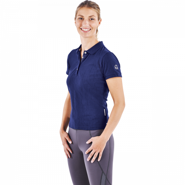 Koszulka damska polo Busse Crew z kołnierzykiem. Zapinana u góry na guziczki. W sportowym stylu. Taliowana. Krótki rękaw. Materiał funkcyjny zapewnia optymalną swobodę ruchów. Można prać, szybkoschnąca, nie wymaga prasowania. Materiał: 80% poliester, 16% nylon, 4% elastan. Kolor: granatowy navy.