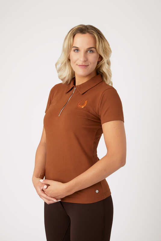 Elegancka koszulka polo Horze Amy. Bardzo wygodna i elastyczna koszulka, która nie będzie krępowała Twoich ruchów. Uszyta z miękkiej, wygodnej piki bawełnianej z domieszką stretchu. Na piersi znajduje się cekinowa aplikacja w kształcie podkowy. Materiał: 95% bawełna, 5% elastan. Prać w temp. 30 stopni z podobnymi kolorami. Nie używać płynu zmiękczającego. Nie suszyć w suszarce.