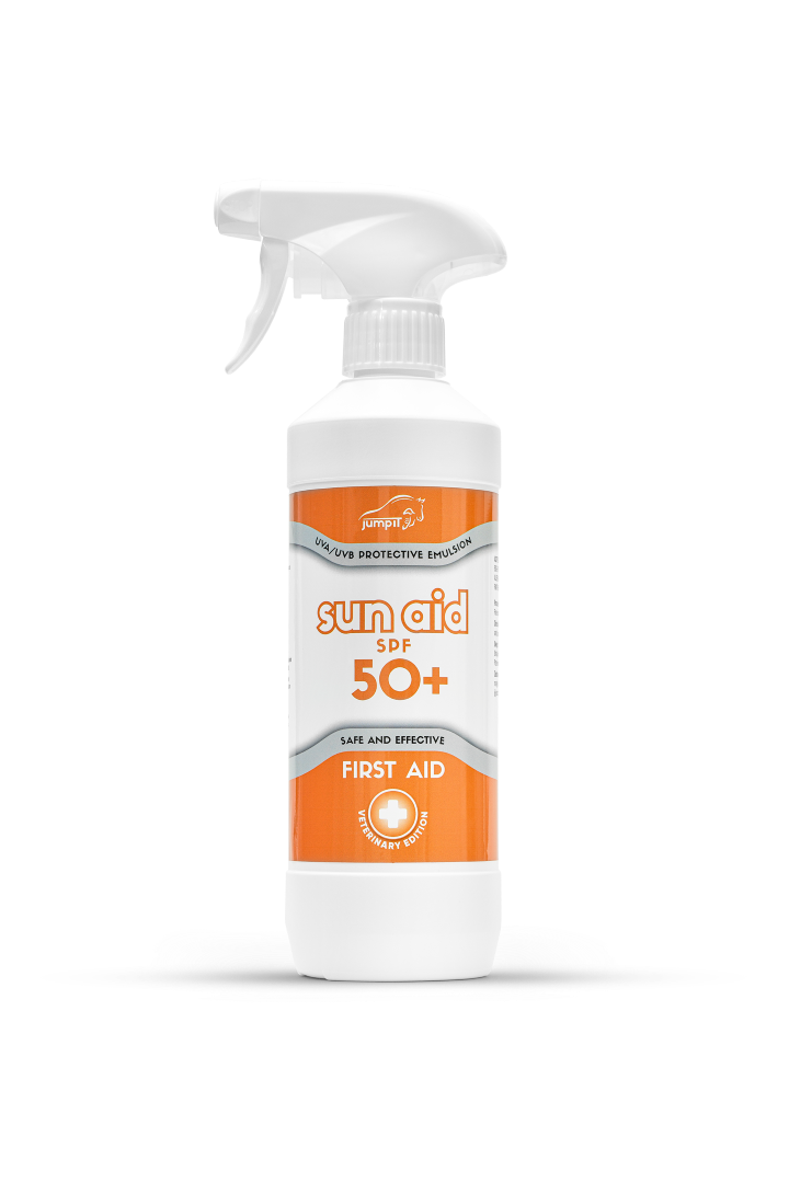 Krem z ochroną SPF w sprayu JUMP IT Sun Aid to niezbędny produkt każdej letniej pielęgnacji konia. Idealny dla koni o jasnej sierści, różowej i wrażliwej skórze lub skłonnościach do oparzeń słonecznych. Bezpieczny, wydajny i skuteczny – stworzony z myślą o koniach przebywających na padokach i pastwiskach w upalne dni.
