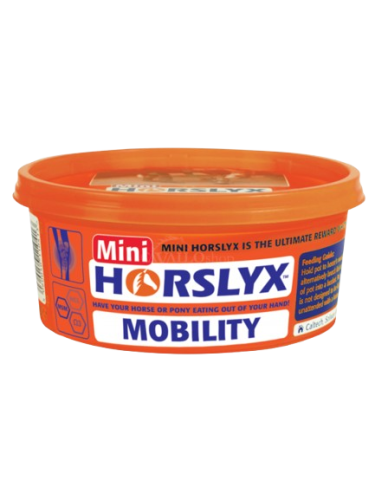 Dodatek paszowy uzupełniający witaminy i minerały HORSLYX Mobility w formie lizawki dla koni. Lizawka zawiera chlorowodorek glukozaminy, MSM i kwasy omega, które wspierają zdrowie stawów koni w każdym wieku i każdej rasy, zarówno u koni sportowych wymagających wsparcia dla ciężko pracujących stawów, jak i u starszych koni, u których na przestrzeni lat mogły wystąpić oznaki zużycia i uszkodzenia stawów.