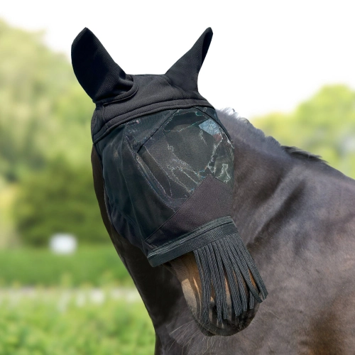 Maska przeciw owadom York Syntia 3w1 – wszechstronna maska dla konia z osłoną nosa i frędzlami. Skuteczna ochrona przed owadami.