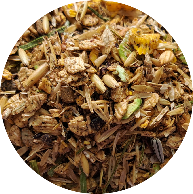płatki jęczmienia mikronizowane, płatki kukurydziane mikronizowane, łuska owsiana, wytłoki jabłkowe, otręby pszenne, melasa, płatki groszku zielonego, mączka z lucerny, wysłodki buraczane, susz z lucerny, chleb świętojański, olej rzepakowy, nasiona słonecznika, marchew, topinambur, burak czerwony, aronia, algi morskie, liść babki lancetowatej, nasiona kozieradki, kwiat nagietka, chlorek sodu, węglan wapnia, fosforan jednowapniowy, tlenek magnezu