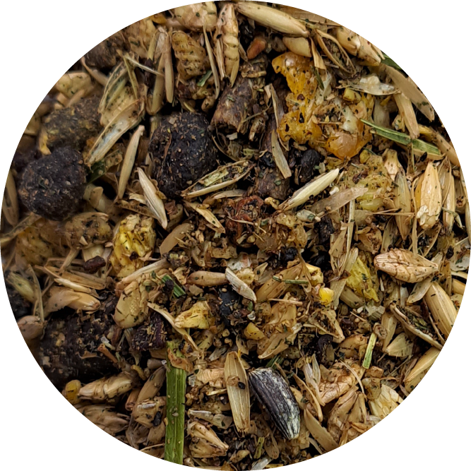 płatki jęczmienia mikronizowane, pulpa jabłkowa, płatki kukurydzy mikronizowane, łuska owsiana, mączka z lucerny, melasa, olej rzepakowy, płatki soi, susz z lucerny, marchew, ziarno słonecznika, burak czerwony, pasternak, topinambur, chlorek sodu, kwiat nagietka, nasiona kozieradki, liść babki lancetowatej, algi morskie, węglan wapnia, fosforan jednowapniowy, tlenek magnezu