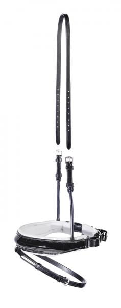 Nachrapnik szwedzki; wykończony lakierowaną skórą bardzo szeroki pasek nosowy podszyty miękką tkaniną zwęża się po bokach.