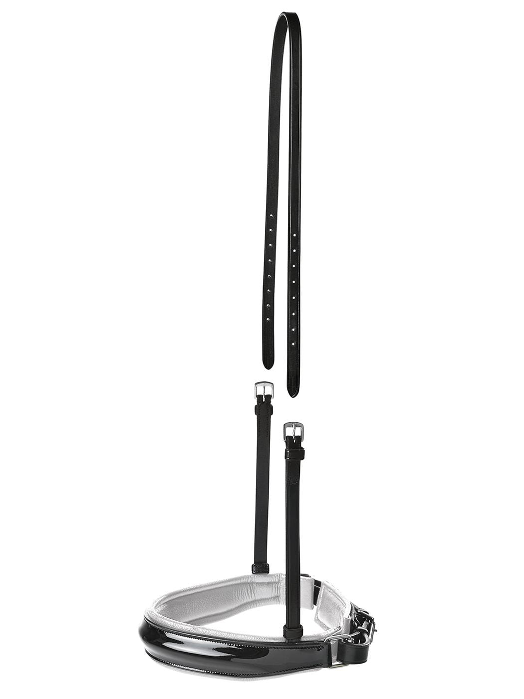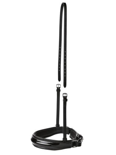 Wykonany z najlepszej włoskiej skóry uzdowej. Nachrapnik szwedzki; wykończony lakierowaną skórą bardzo szeroki pasek nosowy podszyty miękką tkaniną zwęża się po bokach.