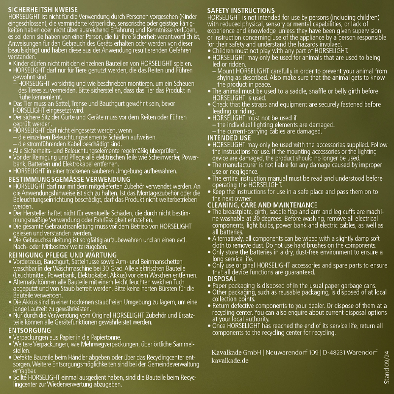 Napierśnik Kavalkade Horselight to innowacyjne rozwiązanie dla wszystkich jeźdźców, którzy dbają o bezpieczeństwo swoje i swoich koni podczas jazdy po zmroku lub w słabym oświetleniu. Wyposażony w jasne, regulowane światło LED zasilane za pomocą power banku, napierśnik zapewnia doskonałą widoczność w ruchu drogowym.