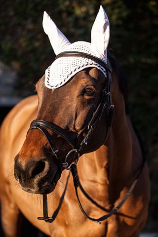 Wysokiej jakości nauszniki BR Xcellence. Skutecznie chronią uszy konia przed kurzem i owadami.
