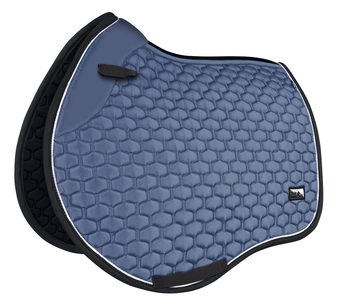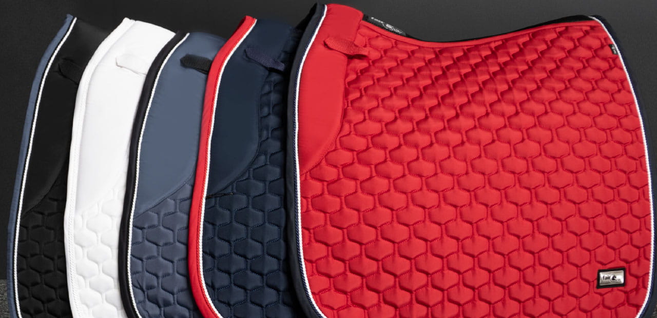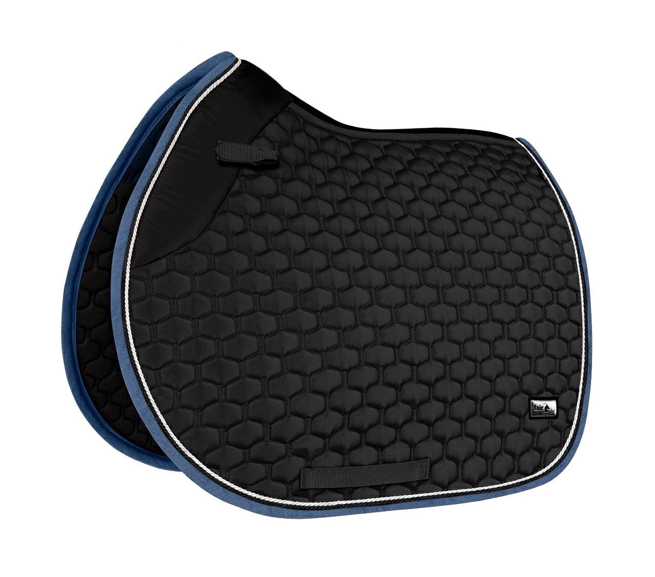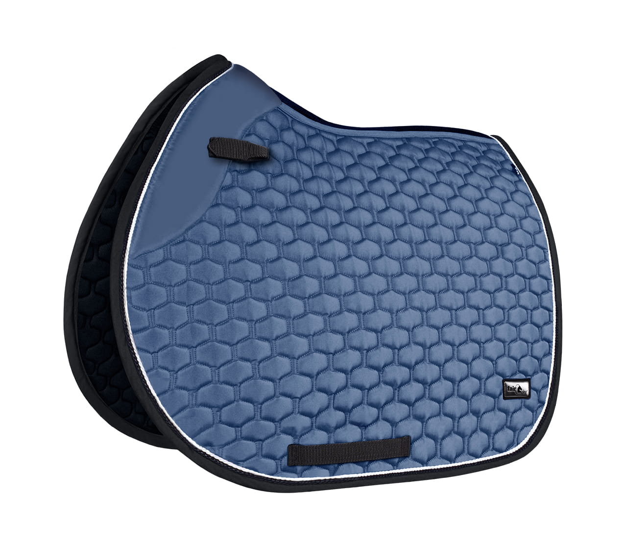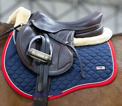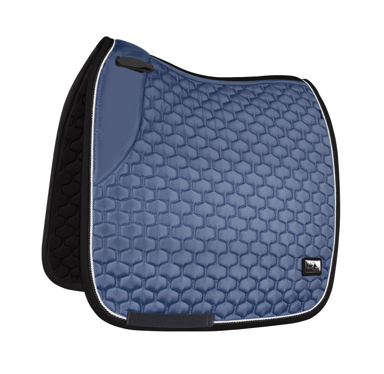 Elegancki, atrakcyjnie przepikowany czaprak Fair Play Azuryt Ceramic Rosegold ozdobiony podwójnym, połyskującym sznurkiem i biżuteryjną taśmą w kolorze różowego złota.