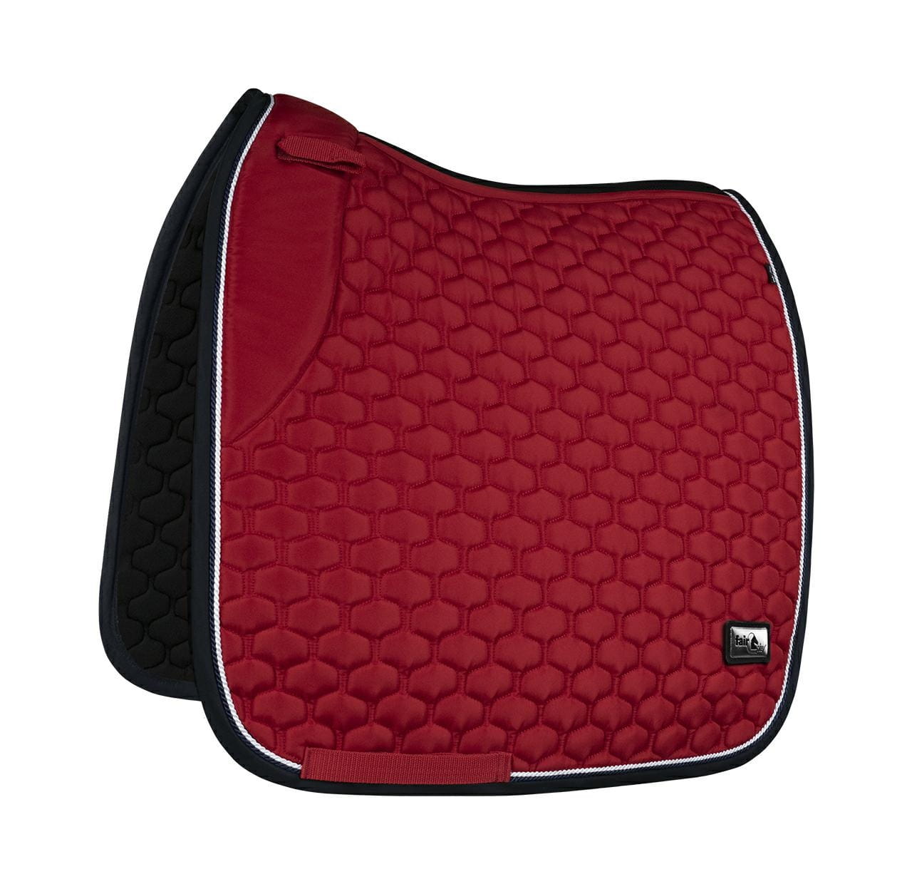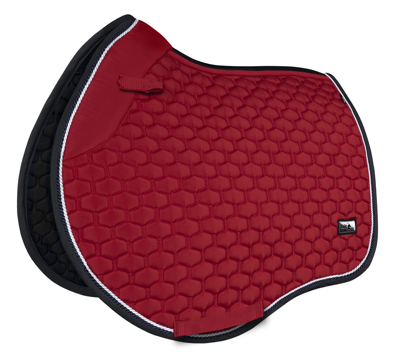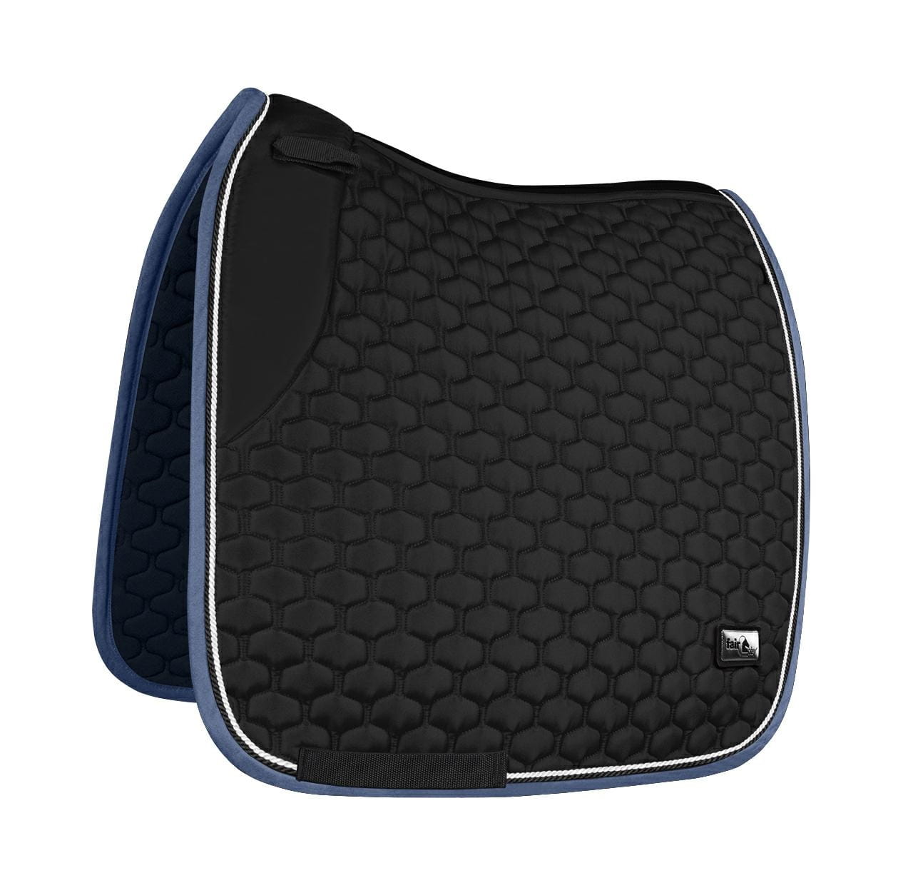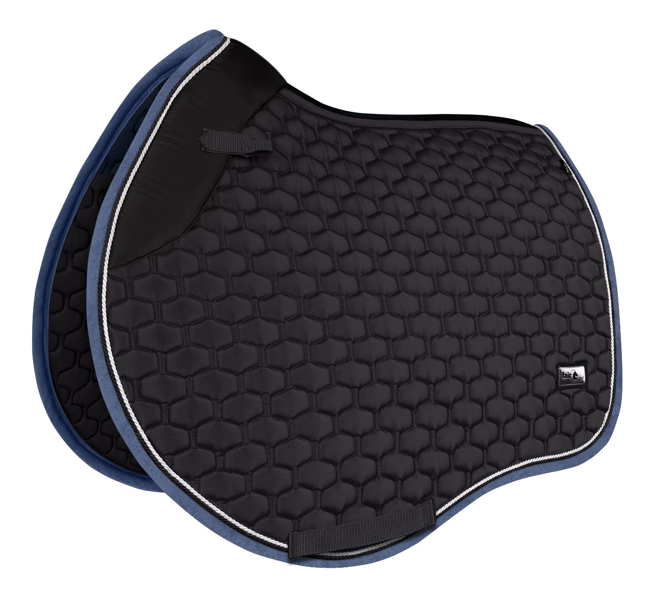 Elegancki, atrakcyjnie przepikowany czaprak Fair Play Azuryt Ceramic Rosegold ozdobiony podwójnym, połyskującym sznurkiem i biżuteryjną taśmą w kolorze różowego złota.