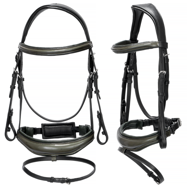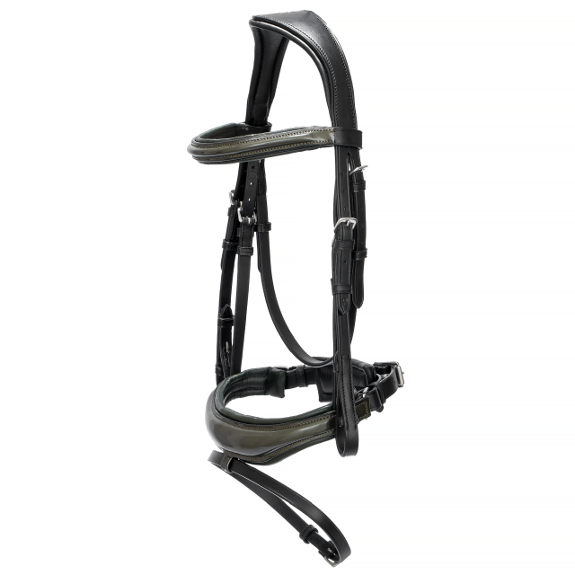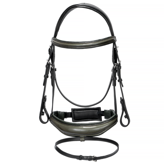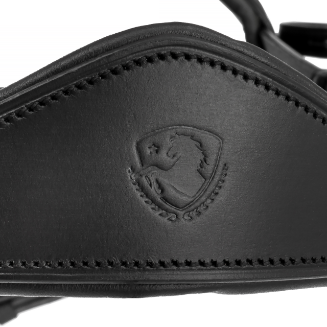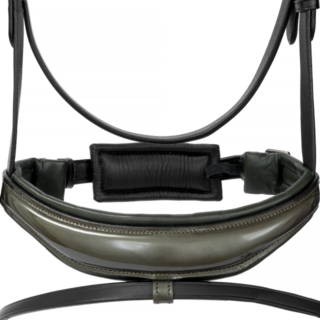 Ogłowie Equestrian Queen Orion łączy nowoczesny design z najwyższym komfortem użytkowania. Elegancki, anatomicznie wyprofilowany nachrapnik, pokryty lakierowaną skórą, nie tylko przyciąga wzrok, ale również zapewnia wygodę dla konia, redukując nacisk i minimalizując ryzyko otarć.