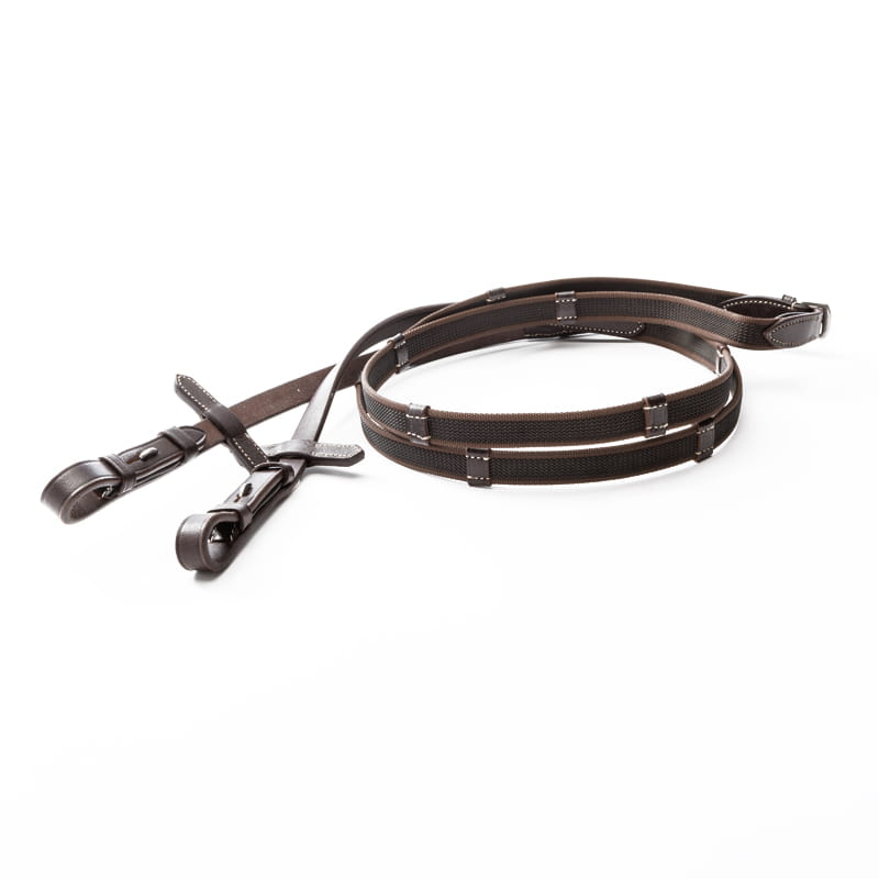 W zestawie wodze z miękkiej skóry z gumową warstwą dla dodatkowej przyczepności i komfortu.