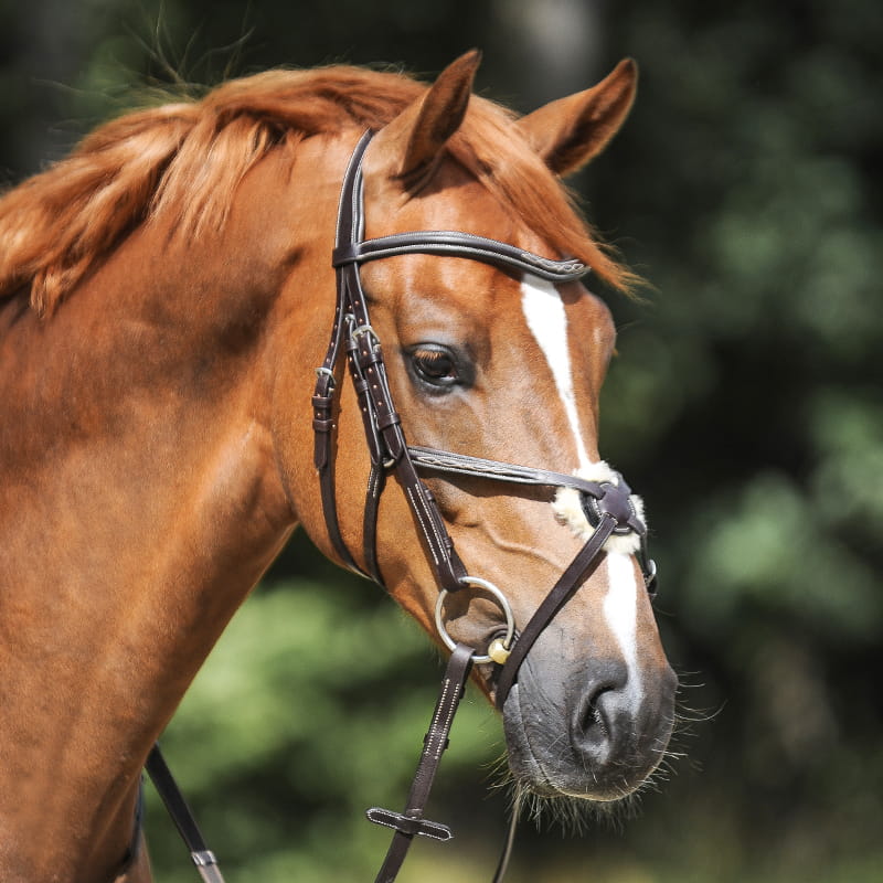 Angielski nachrapnik ma miękką podkładkę pod klamrą dla większego komfortu i jest mocowany po obu stronach nagłówka.