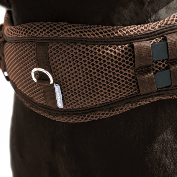 Popręg wykonany jest z wielowarstwowego, wysoce funkcjonalnego materiału siatkowego 3D AIR EFFECT, który cechuje się stabilnym wymiarowo rdzeniem. Trójwymiarowa tkanina syntetyczna zapewnia optymalny rozkład nacisku, stabilność kształtu oraz doskonałą cyrkulację powietrza, co przyczynia się do komfortu konia podczas długich treningów.