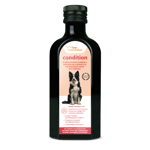 Innowacyjny preparat w formie płynu Canifelox Condition stworzony z myślą o aktywnych, pracujących i sportowych psach. Formuła łatwo przyswajalna wspiera regenerację organizmu, poprawia wydolność oraz wzmacnia naturalną odporność zwierzęcia.
