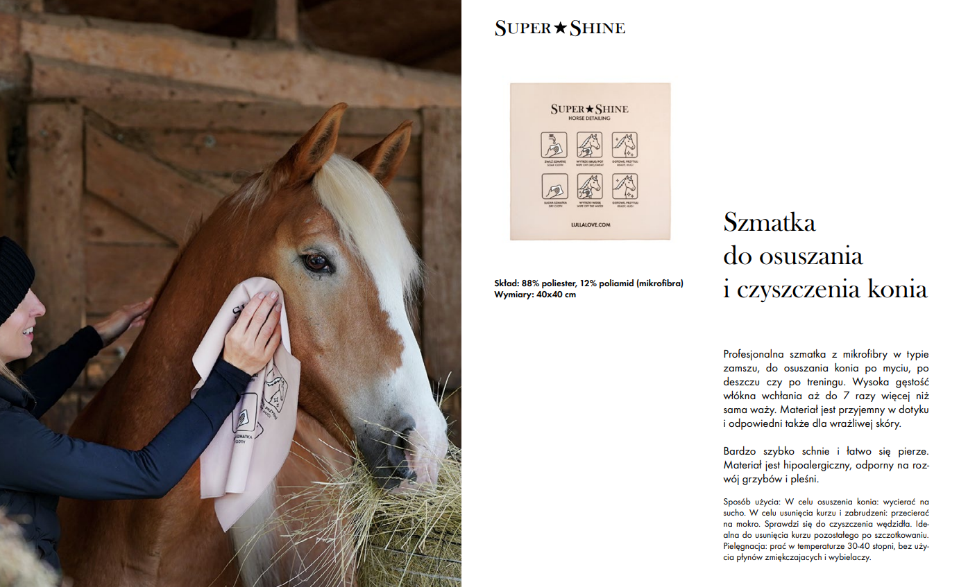 Ręcznik do osuszania koni Lullalove Super Shine to niezastąpiony element wyposażenia każdej skrzynki na kosmetyki i paki jeździeckiej. Wykonany z wysokiej jakości mikrofibry w typie zamszu, doskonale sprawdza się do osuszania konia po kąpieli, treningu, deszczu czy intensywnym wysiłku. Praktyczny zarówno w sezonie letnim, jak i zimowym – szczególnie wtedy, gdy utrzymanie konia w czystości jest utrudnione.