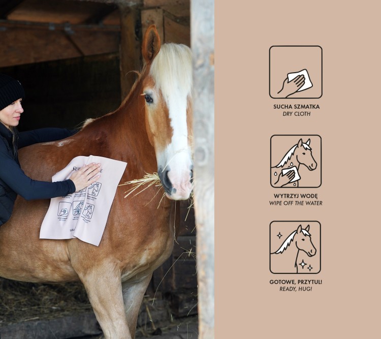Do użytku na sucho i na mokro – idealny do osuszania sierści oraz przecierania konia z kurzu, błota i plam.