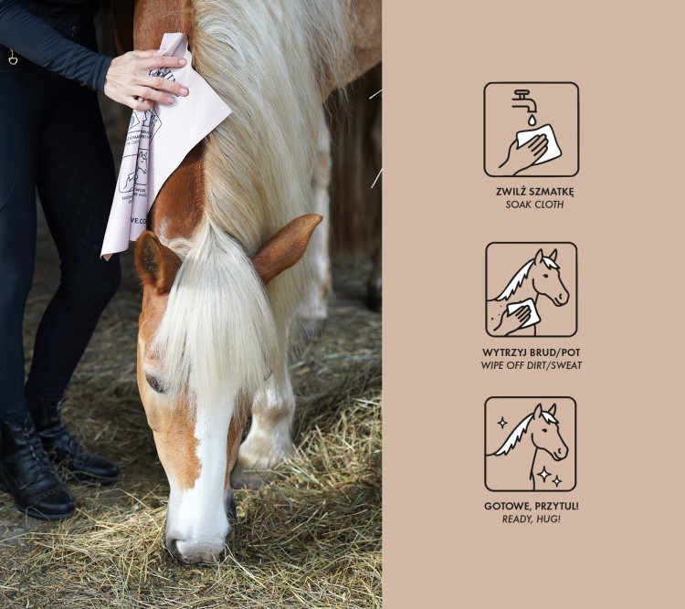 Sposób użycia: W celu osuszenia konia: wycierać na sucho. W celu usunięcia kurzu i zabrudzeni: przecierać na mokro. Sprawdzi się do czyszczenia wędzidła. Idealny do usunięcia kurzu pozostałego po szczotkowaniu.