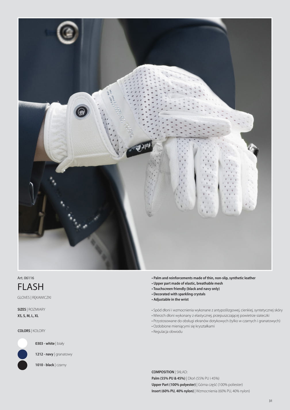 Ozdobione mieniącymi się kryształkami, rękawiczki Fair Play Flash dodają subtelności i elegancji całemu strojowi konkursowemu, jednocześnie podkreślając indywidualny styl jeźdźca.