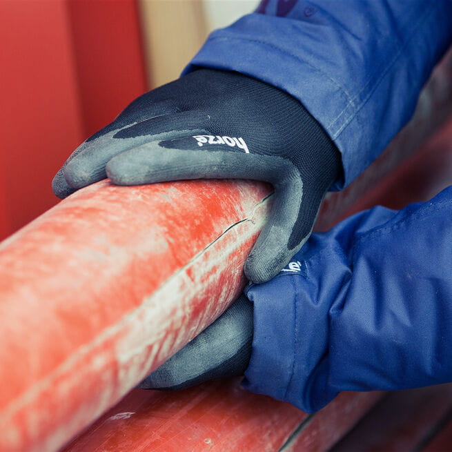 Wewnętrzna strona dłoni pokryta wodoodporną warstwą nitrylu.