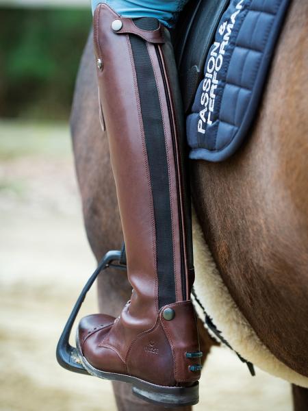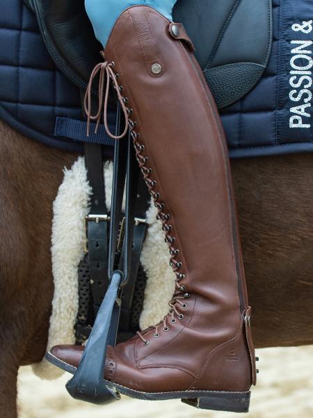 Cholewka od strony konia wykonana z wytrzymałej skóry charakteryzującej się specjalnymi właściwościami antypoślizgowymi.