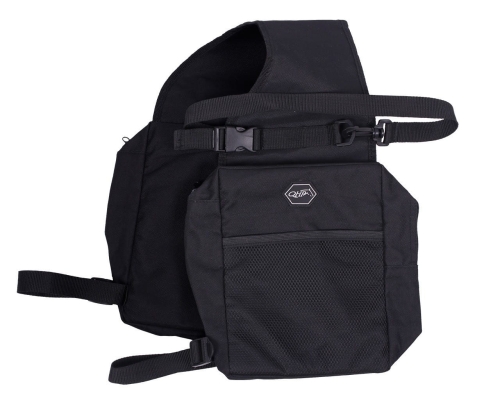 Wysokiej jakości sakwy QHP wykonane z wodoodpornego materiału 600D. Bardzo poręczne i praktyczne sakwy jeździeckie ułatwiają zabranie ze sobą rzeczy podczas jazdy. Zapinane na zamek błyskawiczny. Dodatkowa kieszeń z przodu. Regulowane nylonowe paski. Łatwe mocowanie do siodła. Kolor: czarny. Rozmiar: uniwersalny, Wymiary: dł. 95 x szer. 21 x wys. 26